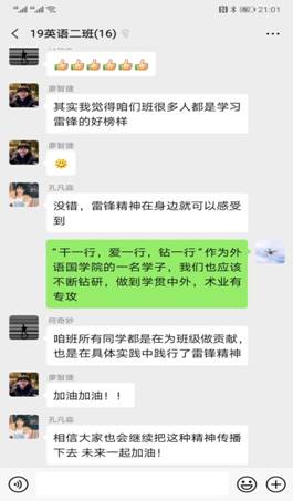 完成线上视频学习后,同学们自主在微信群中展开热烈讨论,纷纷发表对雷锋精神的见解,抒发对雷锋同志的敬佩与缅怀。