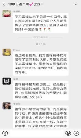 完成线上视频学习后,同学们自主在微信群中展开热烈讨论,纷纷发表对雷锋精神的见解,抒发对雷锋同志的敬佩与缅怀。